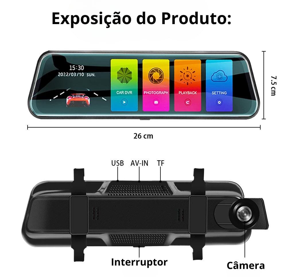 - Câmera de Transmissão: Retrovisor Inteligente 1080P Full HD